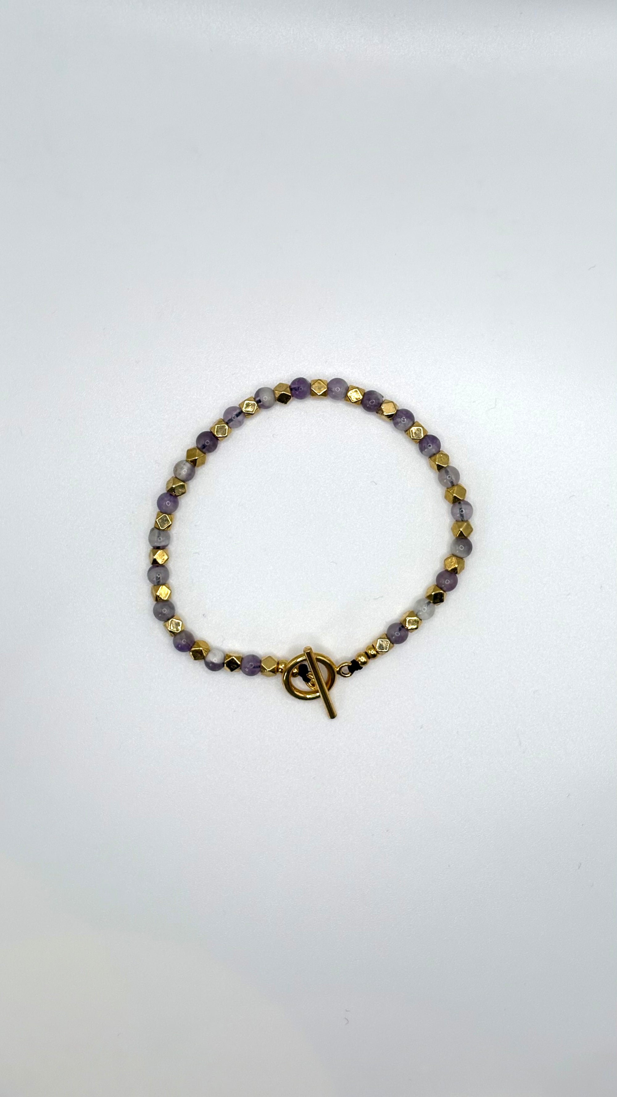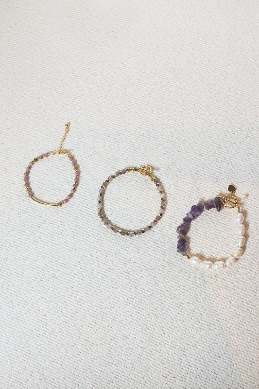 Amethyst Bead Bracelet: Alternating round Amethyst beads and gold accents, creating a color contrast that’s as bold and sophisticated as your next dinner party look.