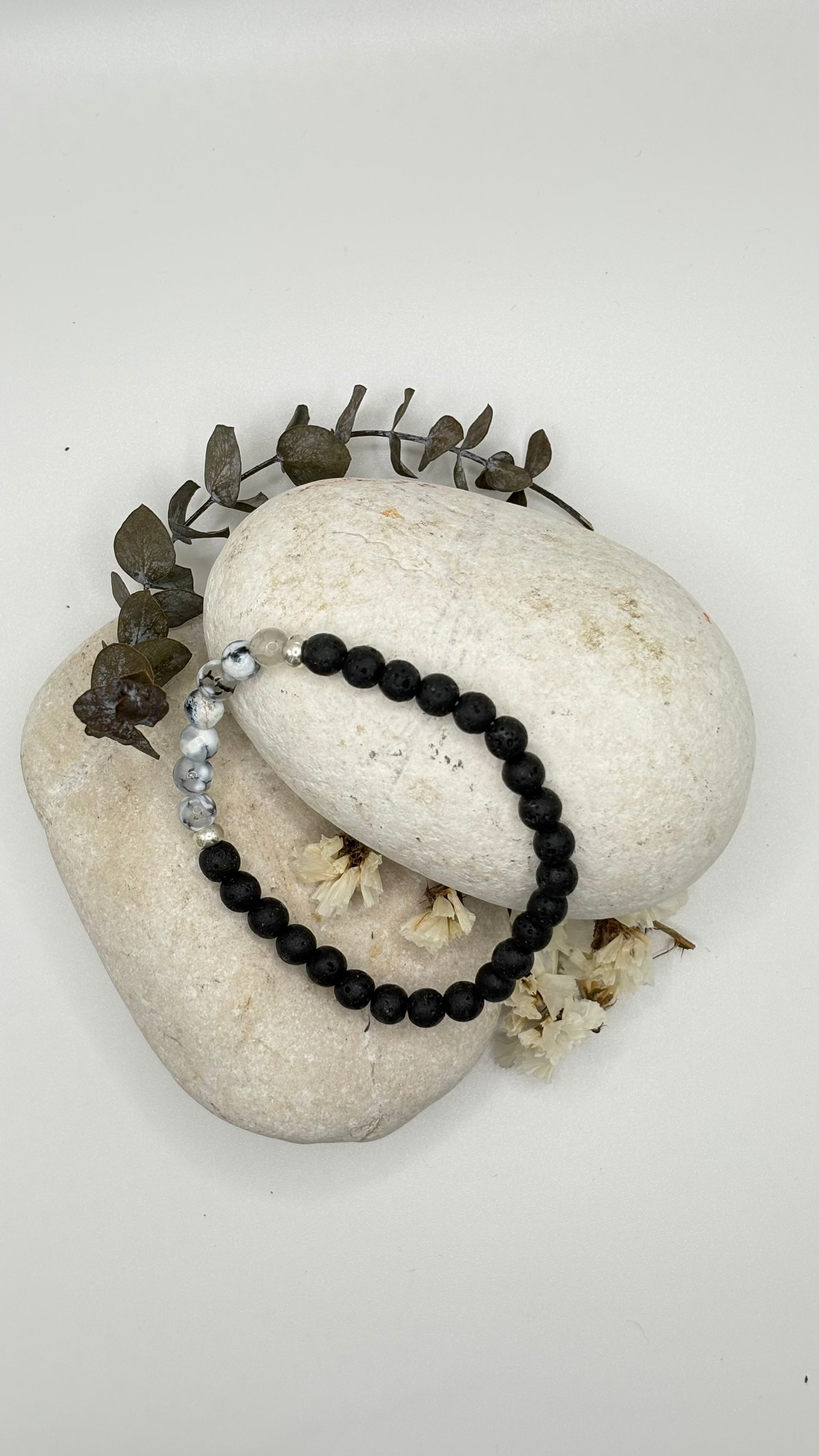 Medium Mixed Stones Bracelet: Half Coffee Fire Agata Stones, believed to enhance mental clarity and calm the mind, and half Black Lava Stone, known for its grounding properties and connection to the earth’s energy.